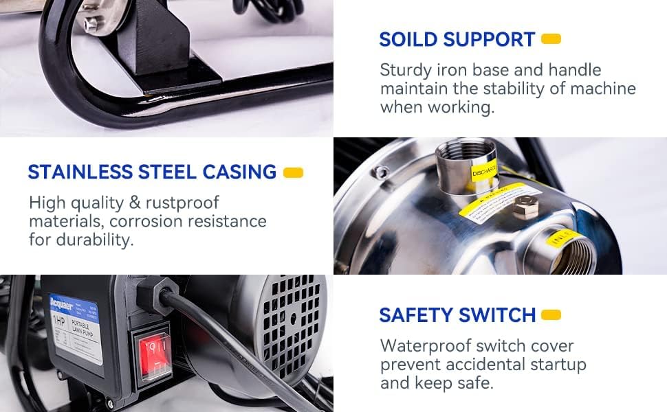 - Portable & Durable Design: The stainless steel casing and aluminum motor housing ensure durability and corrosion resistance. Easy-to-carry Iron handle with lightweight for portability. Waterproof On/Off switch for safety and easy operation. This irrigation pump is designed for lawn, garden, farm with low noise and easy installation