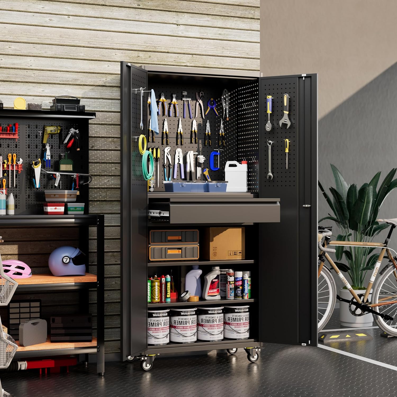 - ă4 Adjustable Shelves & 1 inside draweră Locking cabinet on wheels has 4 adjustable shelves,The 2 pegboard on the backboard can be used as adjustable shelves. The shelves can be adjusted up and down to the desired position for your household items, tools, and other items. 71inch tall storage cabinet has 1 inside drawer, You can store important tools and screws in it. The drawer is carried by two silent tracks, allowing for comfortable pulling.