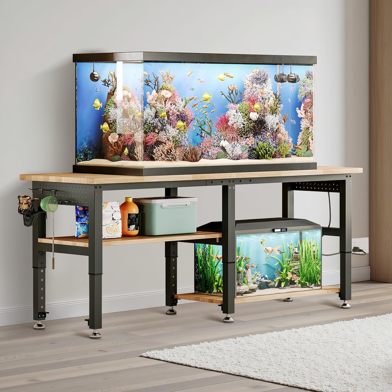 Albott 84" Adjustable 2-Tier Workbench with Solid Wood Top, Max 2000lbs Capacity, Built-in Power Strip with 4 AC Outlets & 2 USB Ports, Pegboard & 20 Hooks, Shop Garage Office