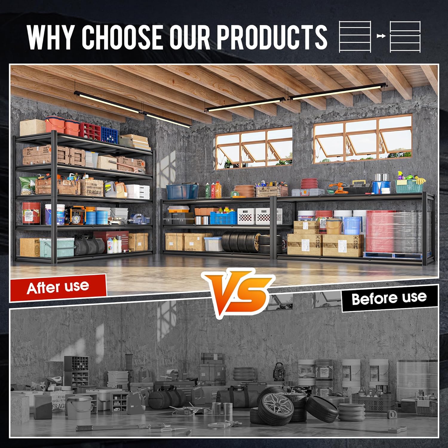 - ăExtra-Wide Garage Shelvingă59.8" W x 72.2" H x 24.2" D, this metal storage shelf offers a huge storage space and can hold all large items. By making use of vertical space, it saves you valuable floor space and is very suitable for garages, pantry, school, library, office, supermarket, warehouse, workshop, outside